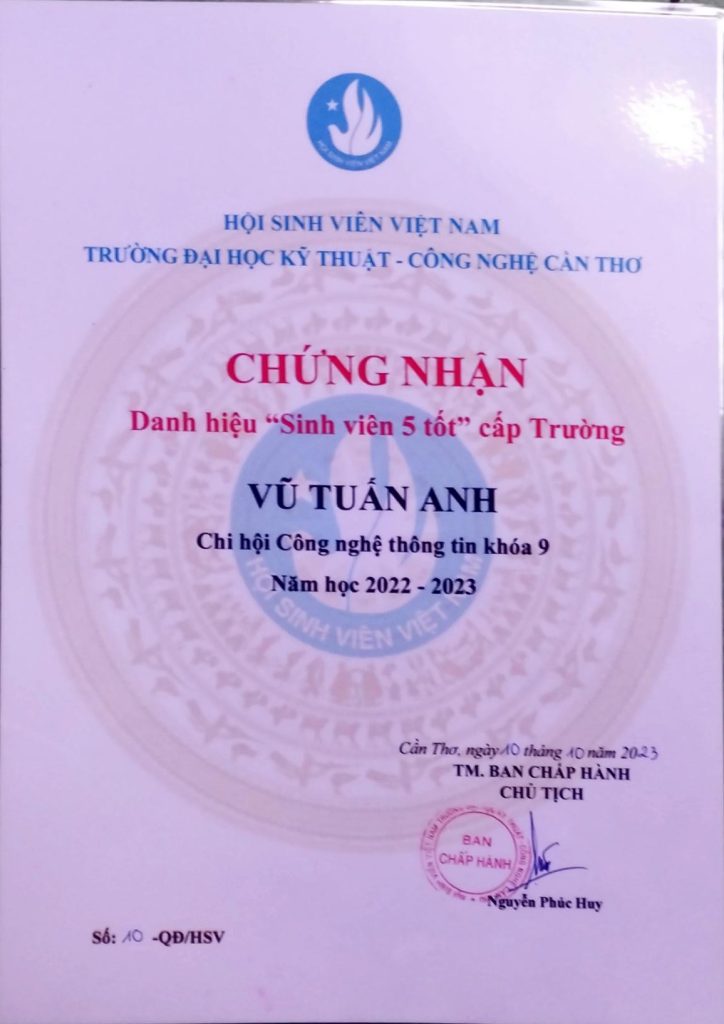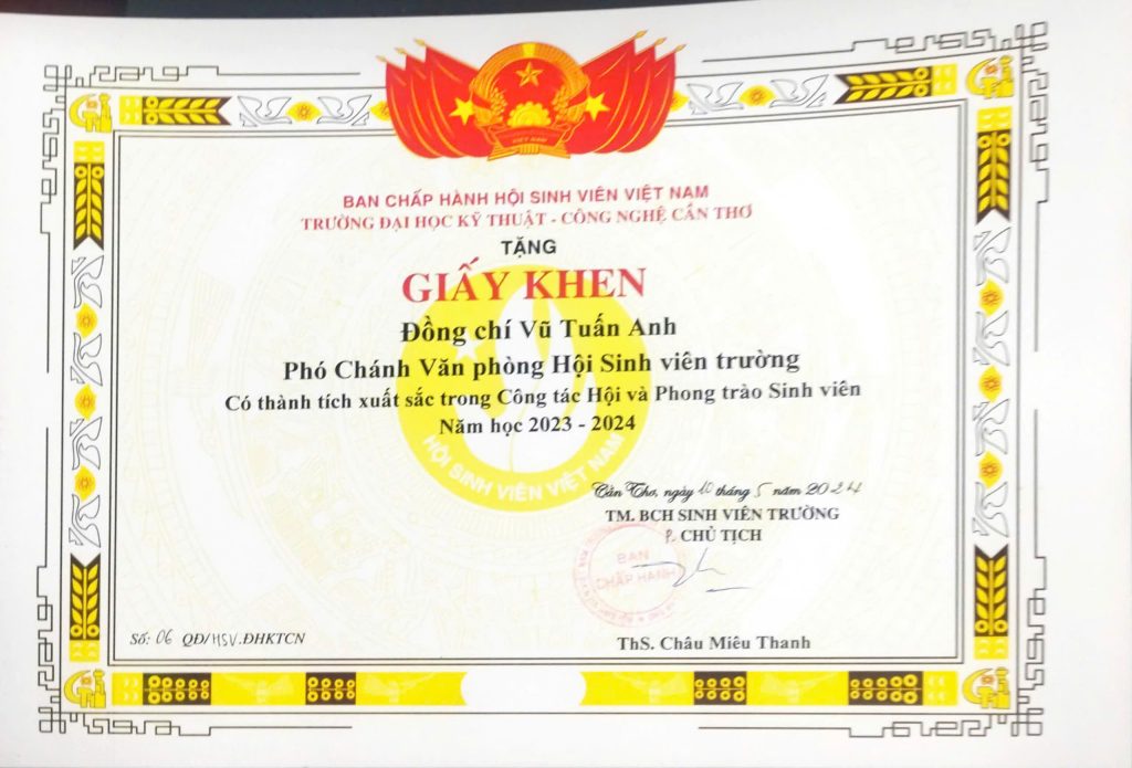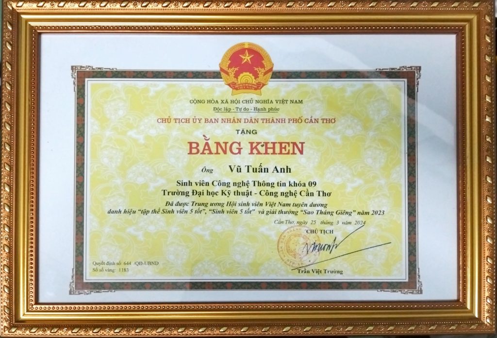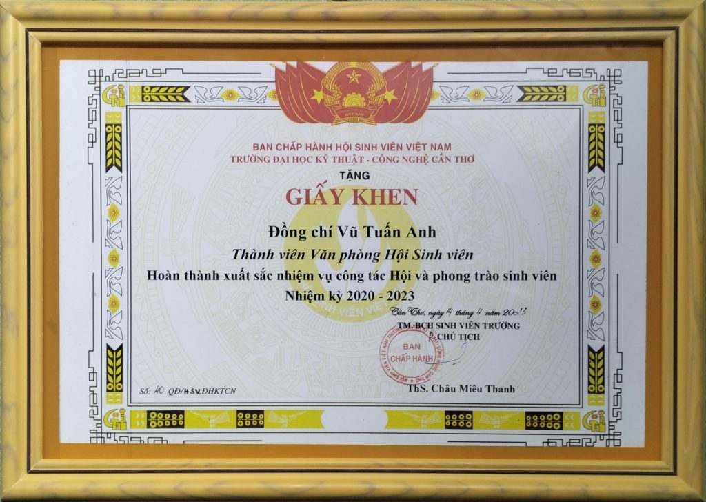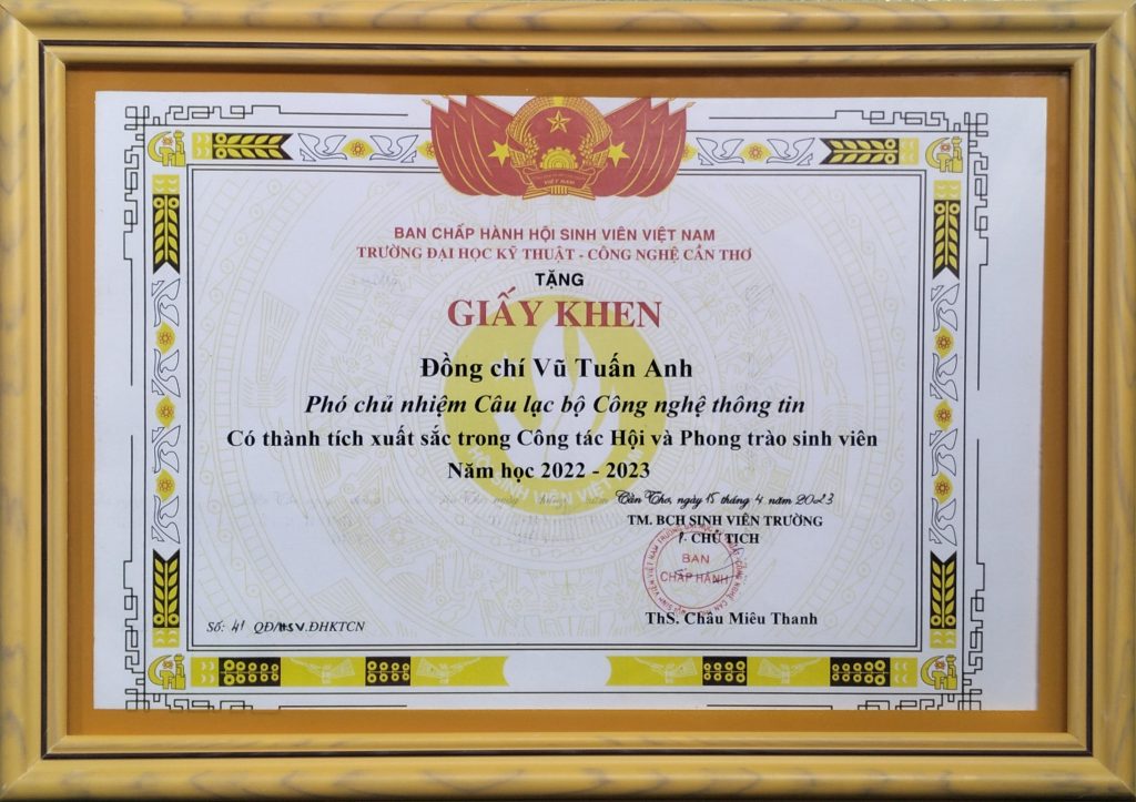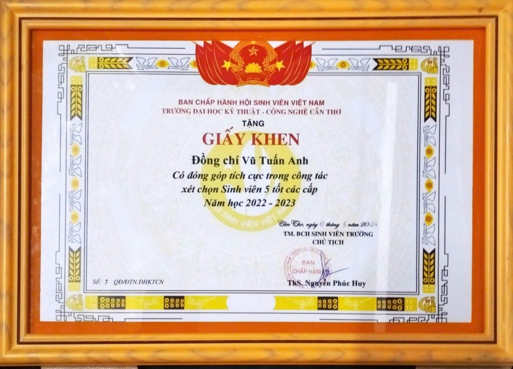 - Ban Chấp hành Hội Sinh viên Việt Nam thành phố Cần Thơ trao tặng Bằng khen “Đã đạt danh hiệu Sinh viên 5 tốt” cấp Trung ương năm học 2022 – 2023