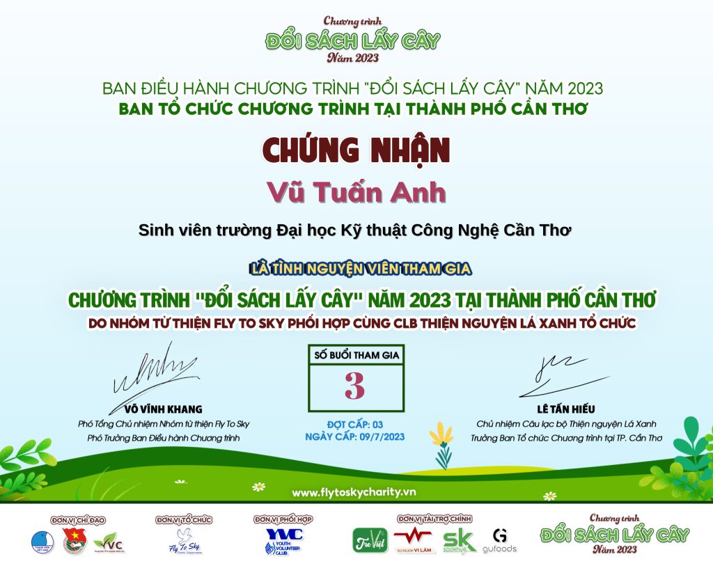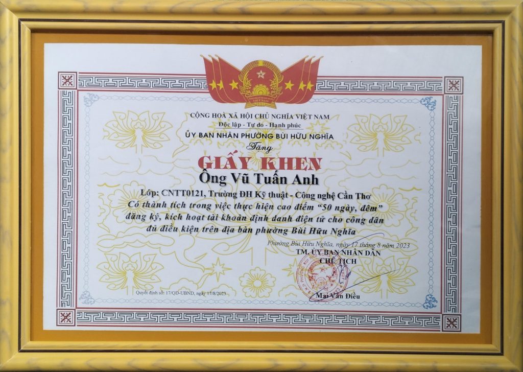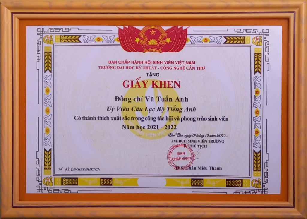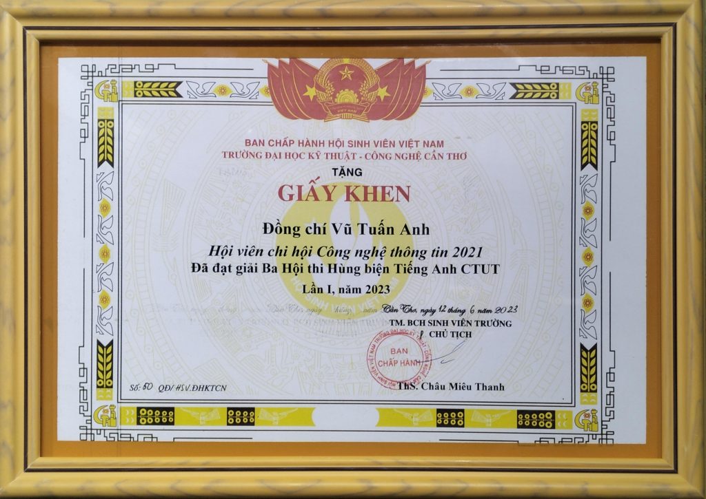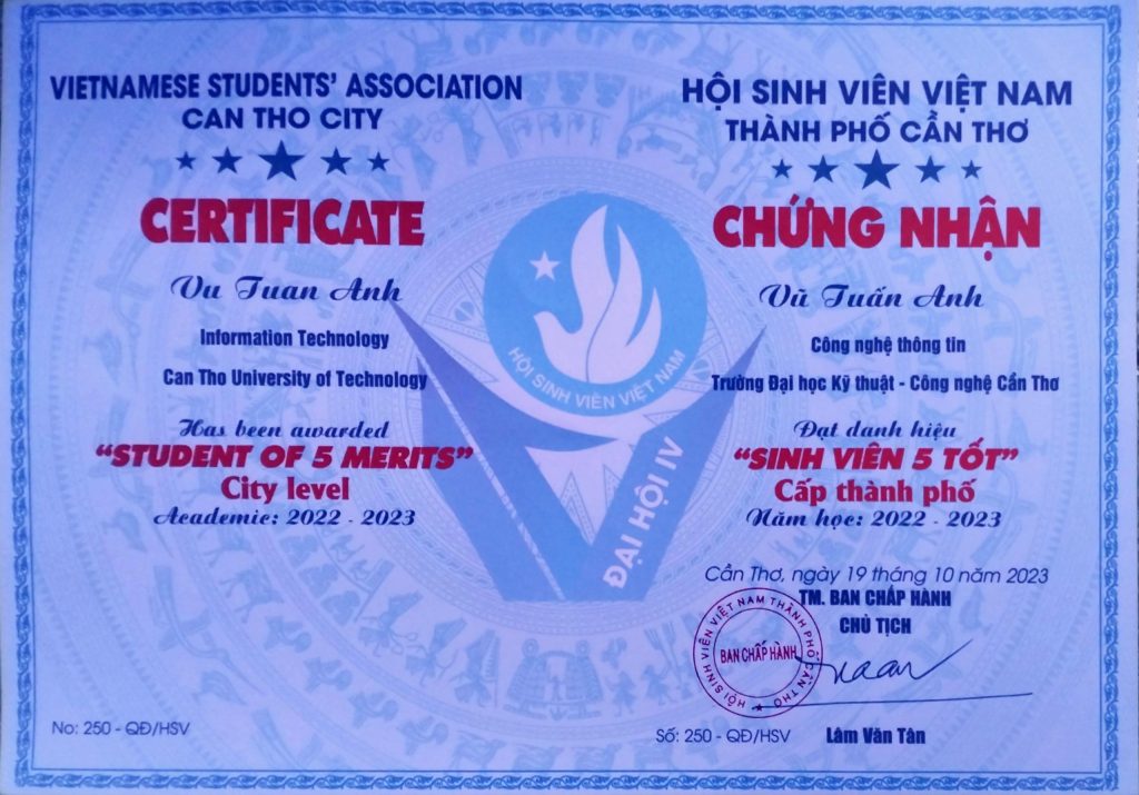 - Ban Chấp hành Hội Sinh viên Việt Nam thành phố Cần Thơ trao tặng Bằng khen “Đã đạt danh hiệu Sinh viên 5 tốt” cấp Trung ương năm học 2022 – 2023