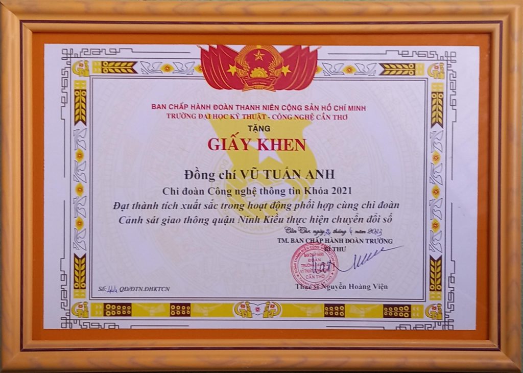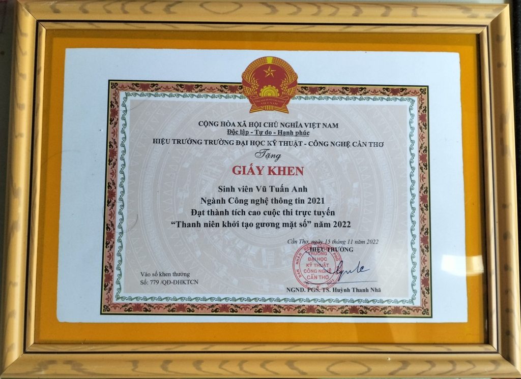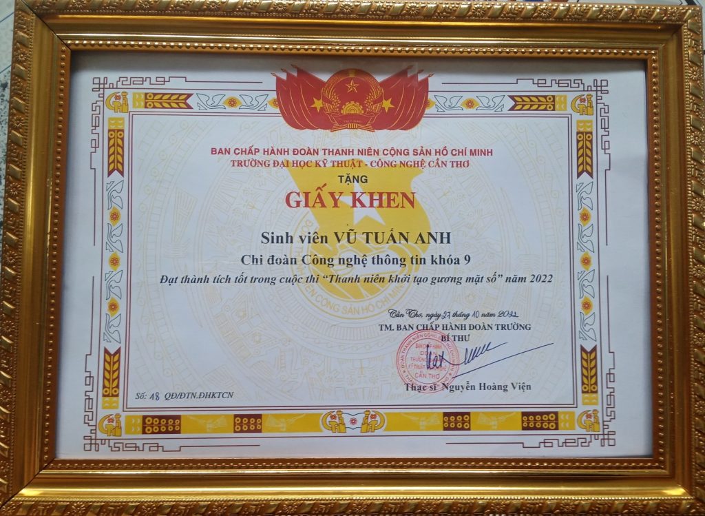- Ban Chấp hành Đoàn TNCS Hồ Chí Minh Trường Đại học Kỹ thuật - Công nghệ Cần Thơ trao tặng giấy khen Đạt thành tích tốt trong cuộc thi “Thanh niên khởi tạo gương mặt số” năm 2022.