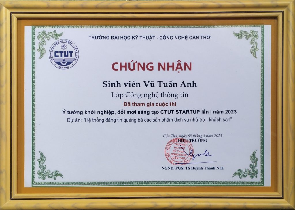 - Ban Chấp hành Đoàn TNCS Hồ Chí Minh Trường Đại học Kỹ thuật - Công nghệ Cần Thơ trao tặng giấy khen Đạt giải Nhì trong cuộc thi “Đi học cùng sinh viên IT” Lần thứ nhất, năm học 2022 - 2023